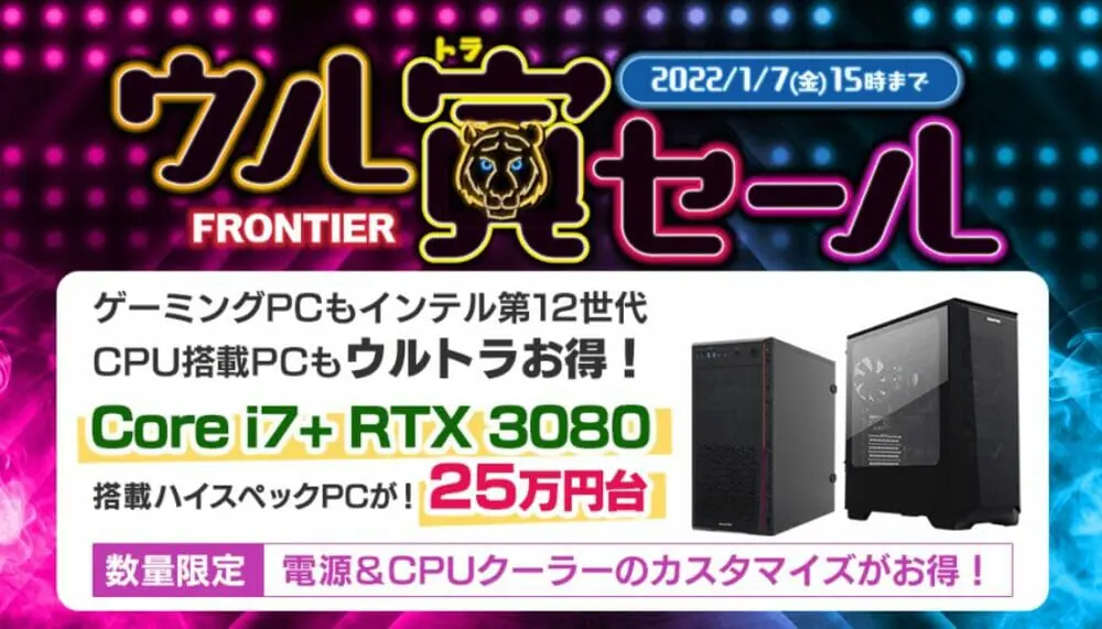 同サイトにおいて、人気の高いRTX3000台グラフィックボードを搭載したハイエンドゲーミングPCを、非常にお得な価格で購入出来る フロンティア『ウル寅セール』が開催されます。