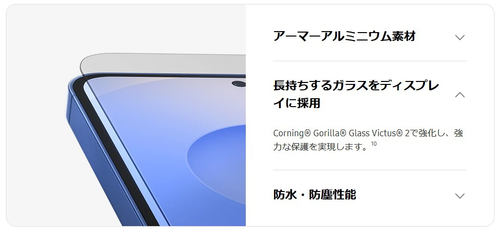 なお、Corning Gorilla Armor 2の保護により、優れた耐衝撃性とスクラッチ(引っ搔き)耐性を備えています。
