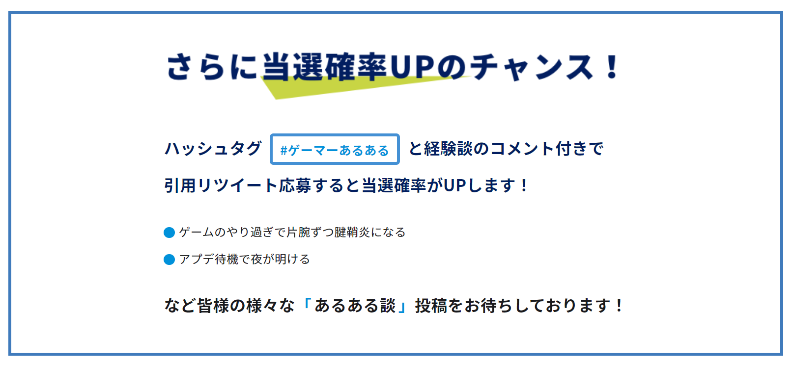 上記ハッシュタグを付けて、なおかつ "ゲーマーあるある" な経験談を載せて投稿することで、当選確率をアップさせることが出来ます。