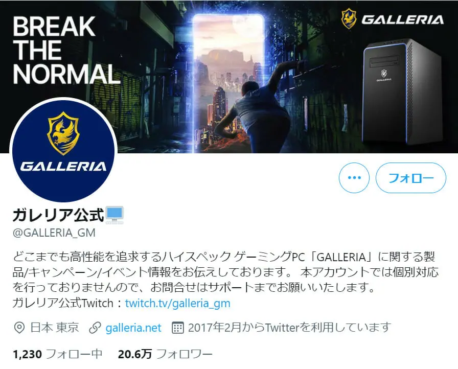 まず最初に、GALLERIA(ガレリア)の公式ツイッターアカウントをフォローしましょう。