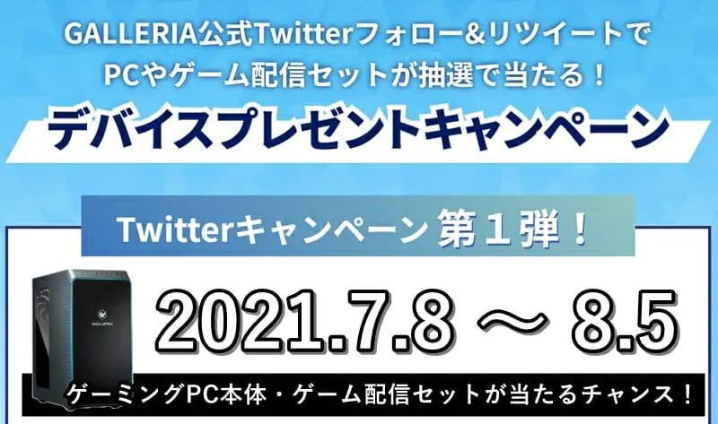 ゲーミングPCで有名なドスパラの『GALLERIA(ガレリア)』にて、公式Twitterのフォロー&リツイートでゲーミングPC本体やゲーム配信セットが当たる抽選キャンペーンが実施されます。