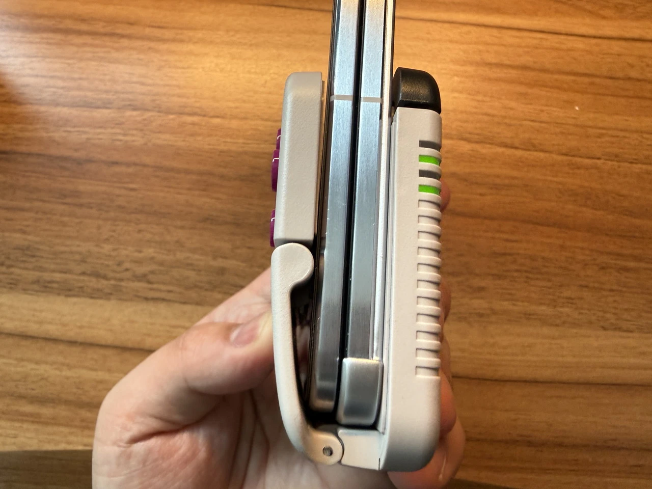両手で端末を支えながら十字キーとボタンで操作するスタイルは、懐かしのゲームボーイそのものです。
