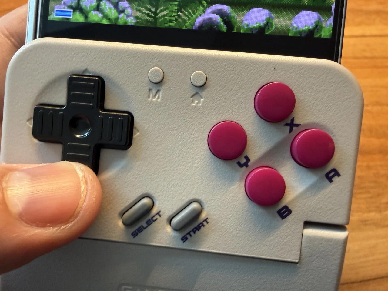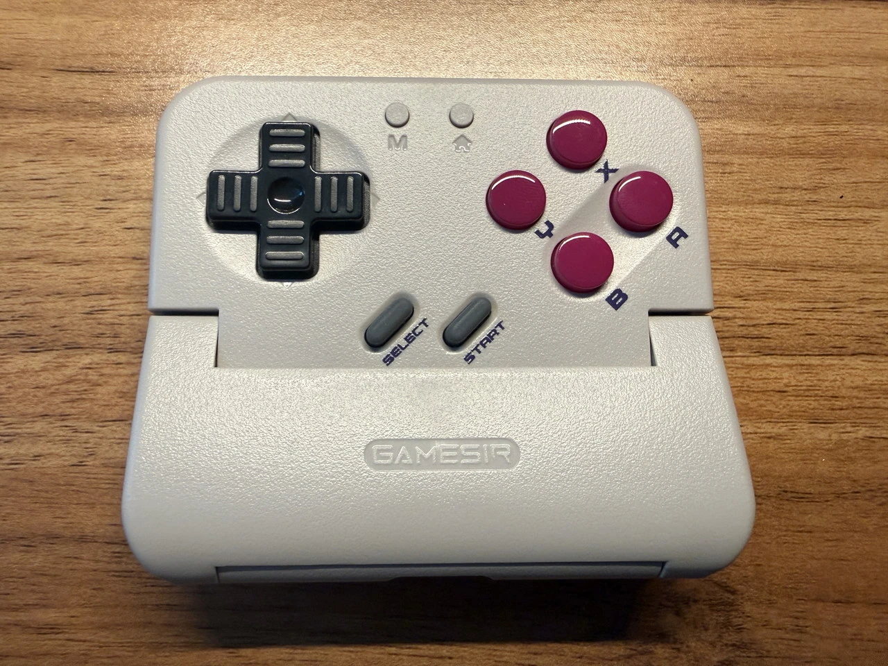 正面には十字キー、セレクトボタン、スタートボタン、ABXYボタン、Mボタン、ホームボタンが用意。アナログスティックは備わっていません。