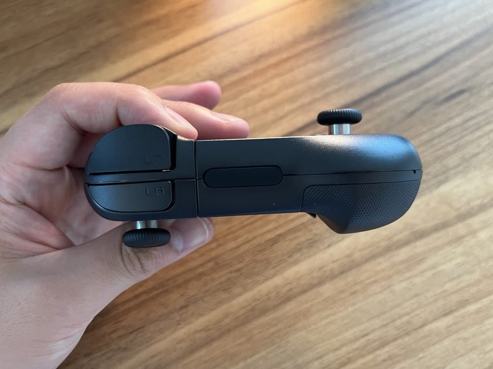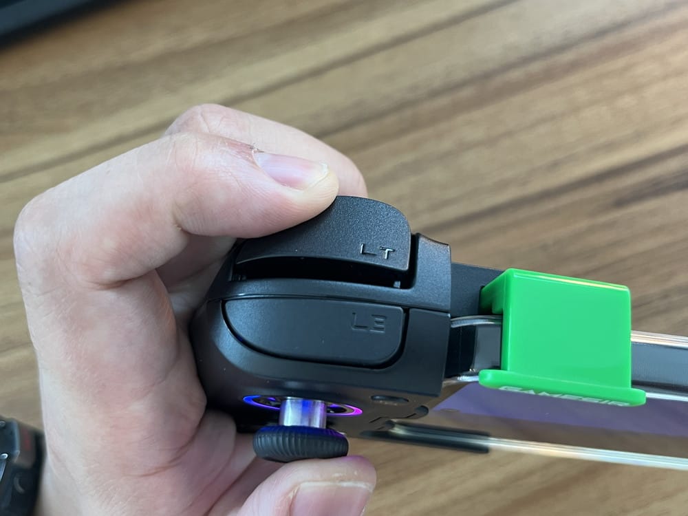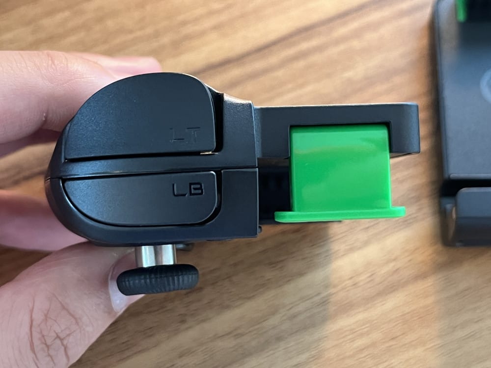 ▼左コントローラーの上部。LT/LBボタンに加えて、スマホ固定用のレバー(緑色)が用意。