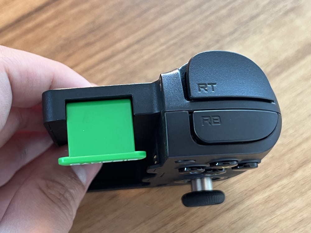 ▼右コントローラーの上部。RT/RBボタンに加えて、こちら側にもスマホ固定用のレバー(緑色)が用意。