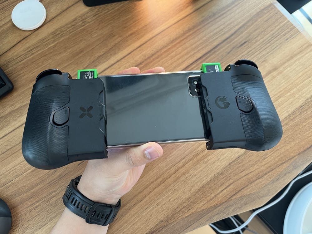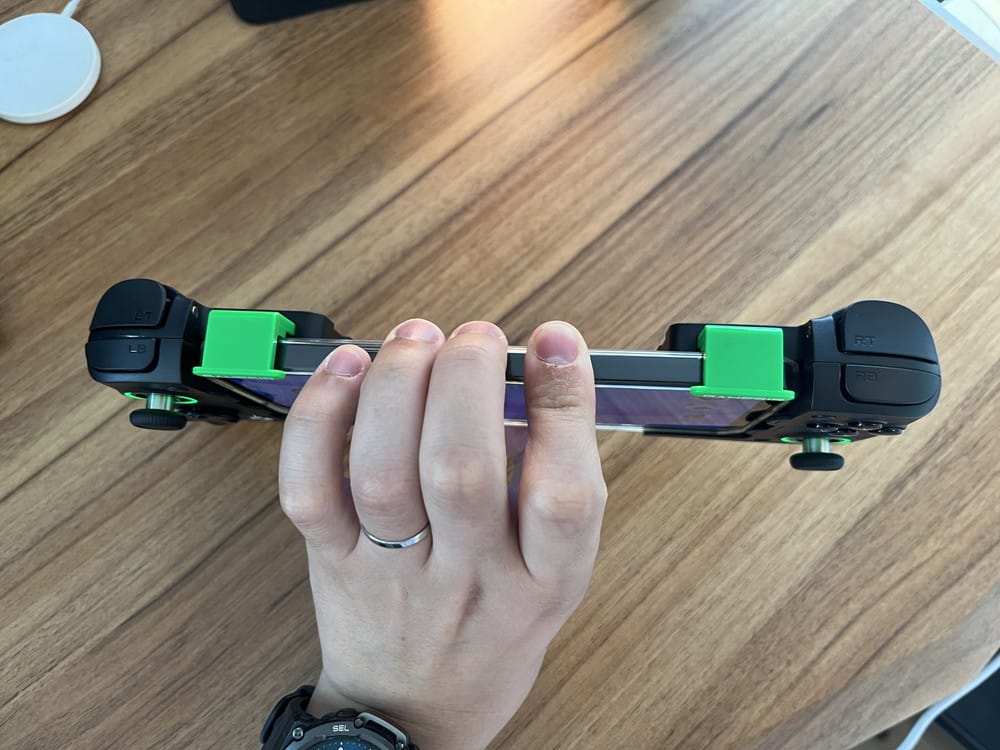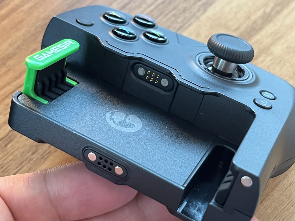 このコントローラーは左右の緑レバーのみでスマホを固定するわけだが、意外とシッカリと固定することが出来ており、スマホを大きく振ってもコントローラーが外れてしまうことはなかった。
