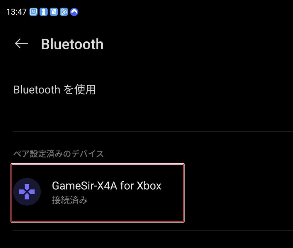続いて、左コントローラーに搭載されたBluetoothボタンを長押ししてペアリング状態にし、Androidスマホ側で「GameSir-X4A for Xbox」を選択する。