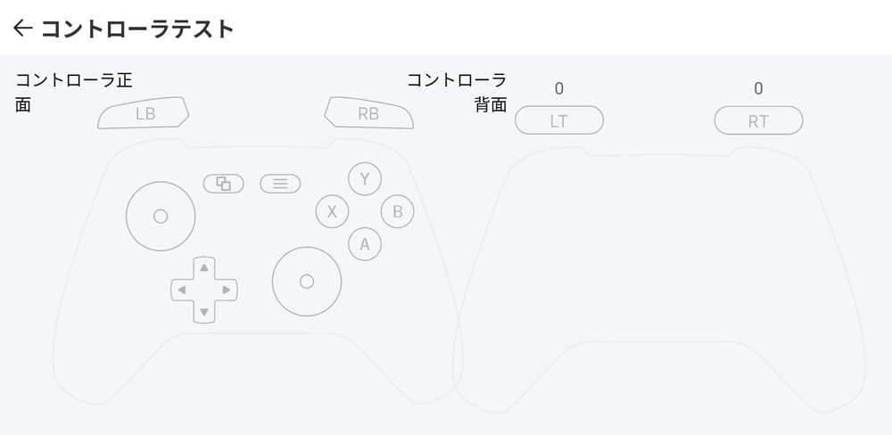 ▼「コントローラーテスト」では、各ボタン・スティック等の入力テストを行うことができる。
