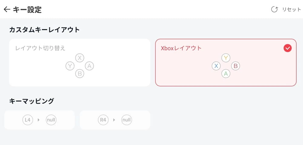 ▼「キー設定」では、各ボタンのレイアウトを入れ替えたり、コントローラー背面のL4/R4ボタンに機能を割り当てることができる。