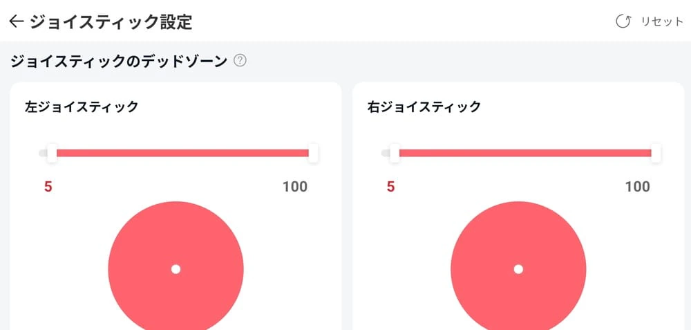 ▼「ジョイスティック設定」では、左右スティックのデッドゾーンを調整できる。