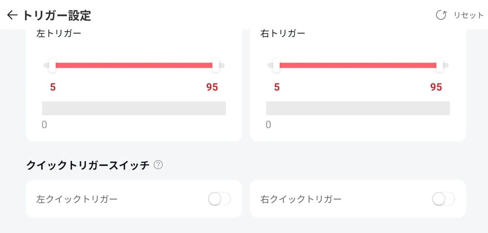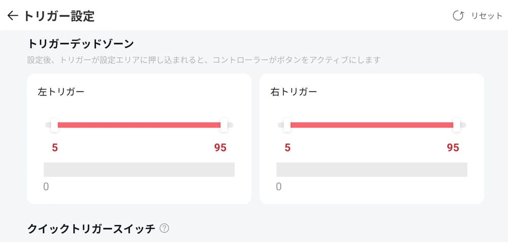 ▼「トリガー設定」では、トリガーのデッドゾーンを調整したり、クイックトリガースイッチのON/OFFを切り替えられる。