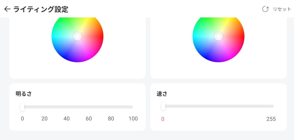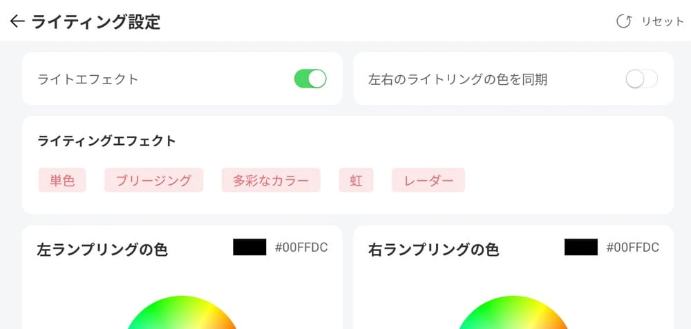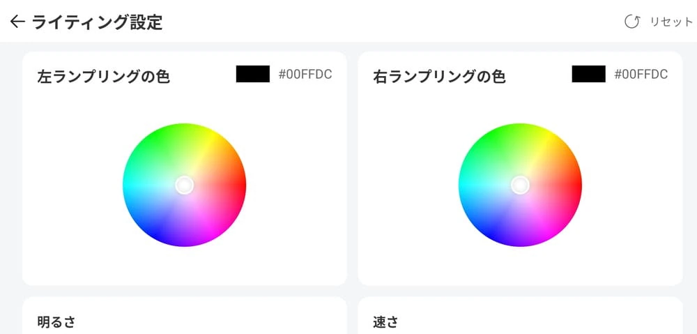 ▼「ライティング設定」では、左右に仕込まれたLEDライトの点灯色やパターン、明るさ、点灯速度などを調整できる。
