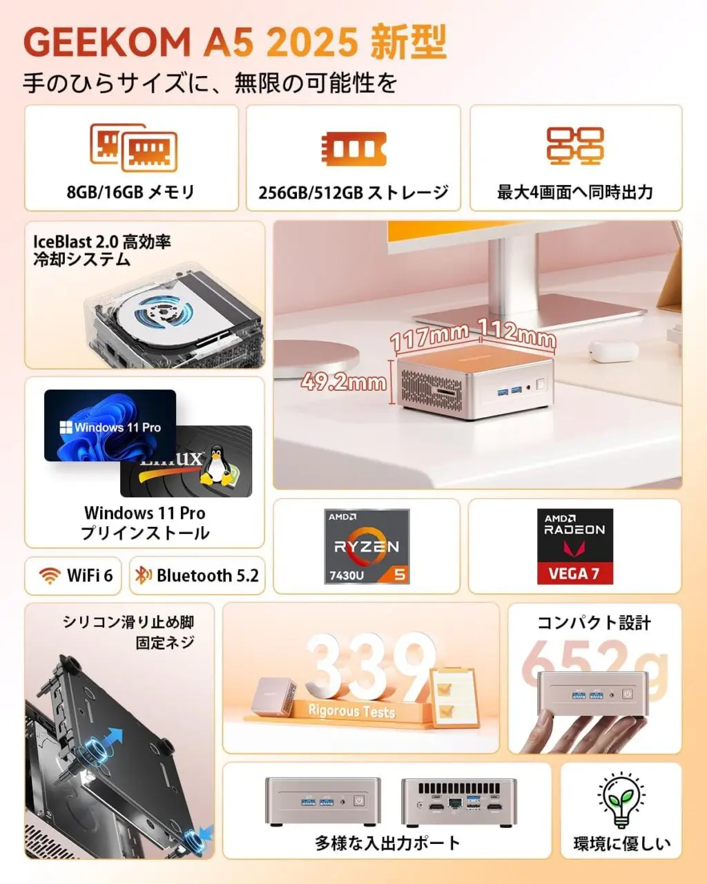 今回紹介した『GEEKOM A5 2025 Edition』について、特長をまとめると以下の通りだ。