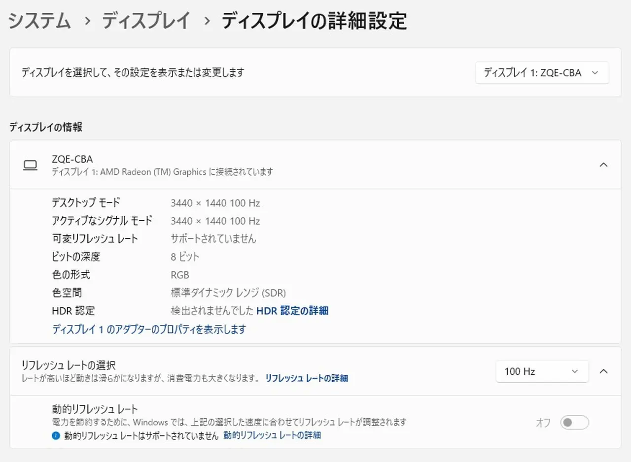 ▼映像出力情報。3440×1440・100fpsで快適に動作する。