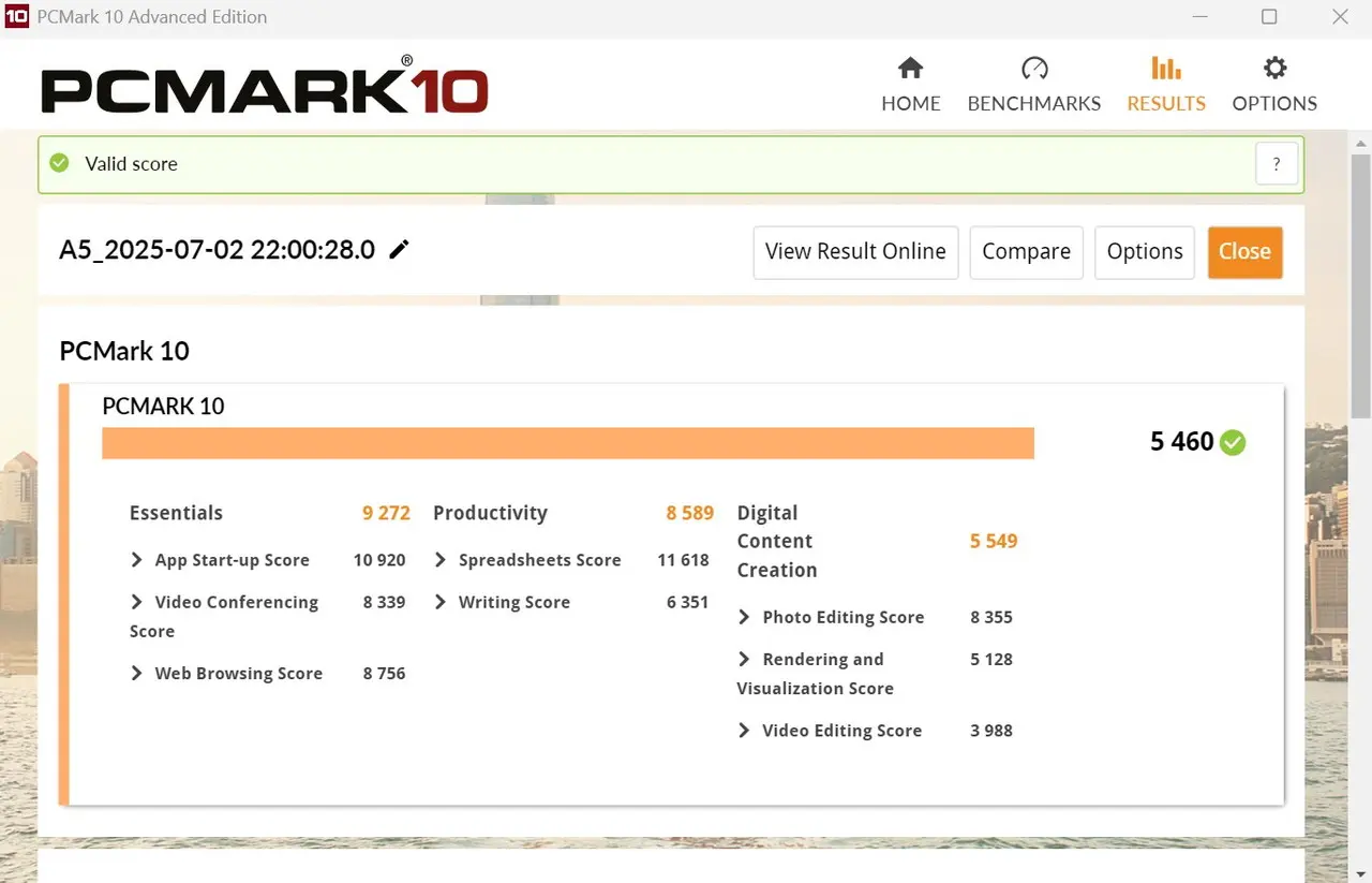 PCMARK10(有料版)のテスト結果は以下の通りとなった。
