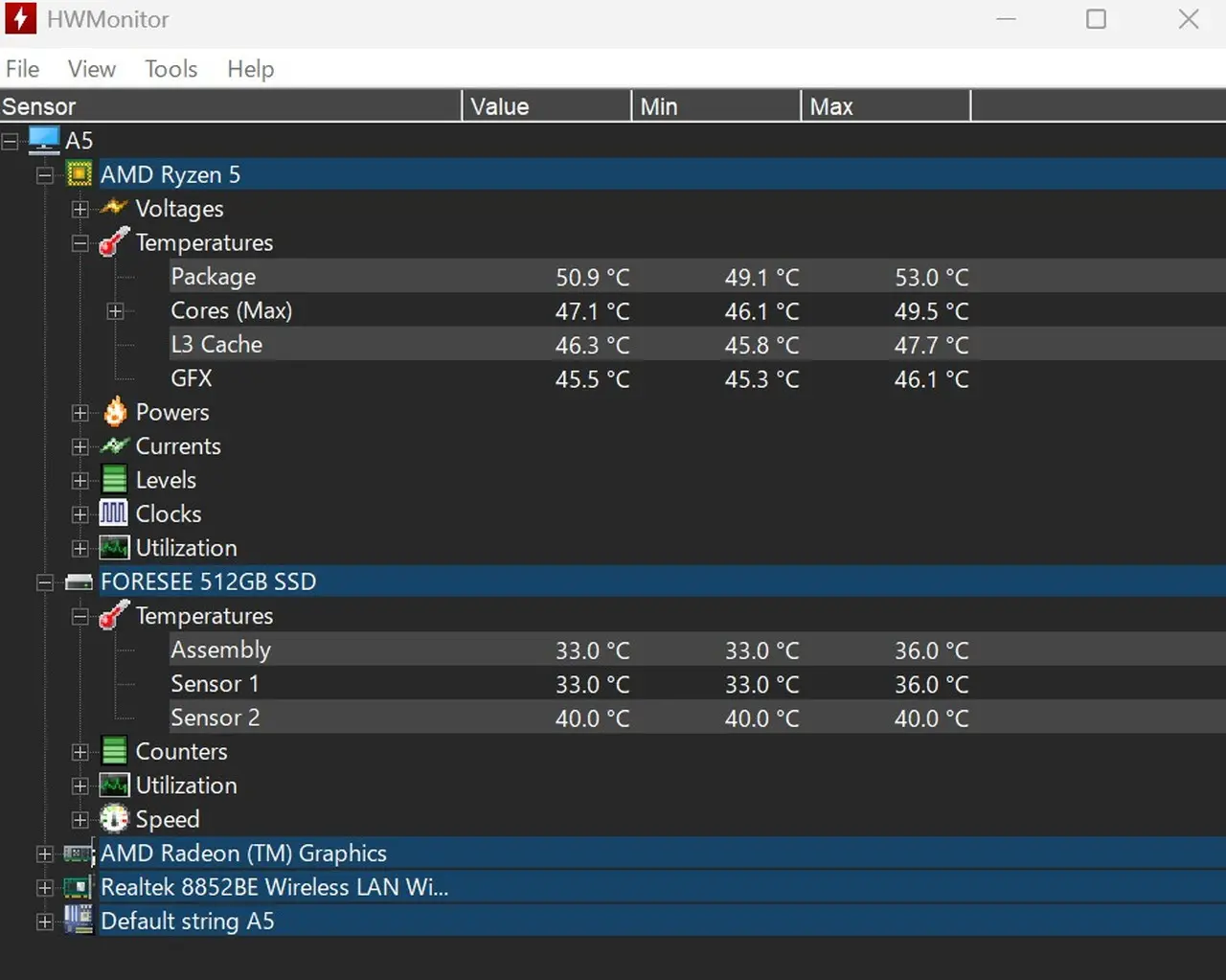 ▼5時間ほど高負荷状態でPCを稼働させ続けた際の内部温度(CPUID HWMonitorによる測定値)。