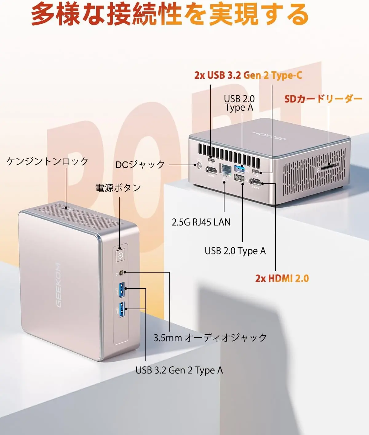 | インターフェース | 【正面】 ・電源ボタン ・3.5mmオーディオジャック ・USB Type-A 3.2 Gen 2 【側面】 ・ケンジントンロック穴 ・SDカードリーダー 【背面】 ・DC電源ポート ・USB Type-C 3.2 Gen 2 ×2 ・HDMI 2.0 ×2 ・2.5G RJ45 LAN ・USB Type-A 3.2 Gen 2 ・USB Type-A 2.0 |