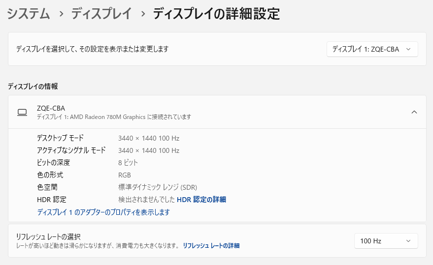 ▼映像出力情報。3440×1440・100fpsで快適に動作する。