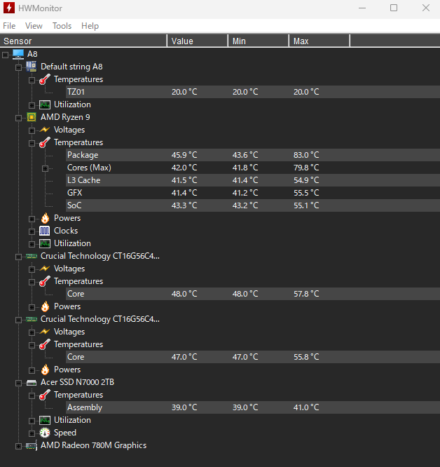 ▼2時間ほど高負荷状態でPCを稼働させ続けた際の内部温度(CPUID HWMonitorによる測定値)。最高温度で80℃を超えることもあったが、基本的に40℃~50℃の範囲で安定していた。