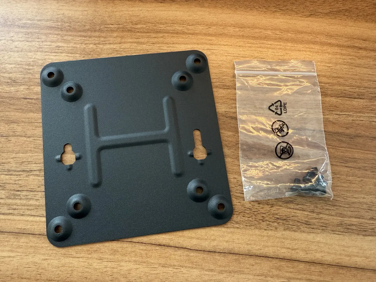 ▼PCをモニター裏へ取り付けるための壁掛けブラケット&ネジが付属。