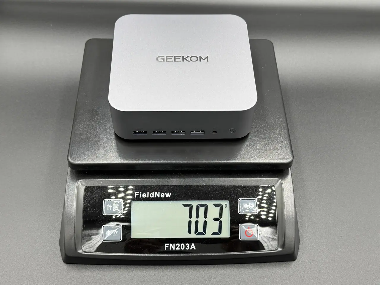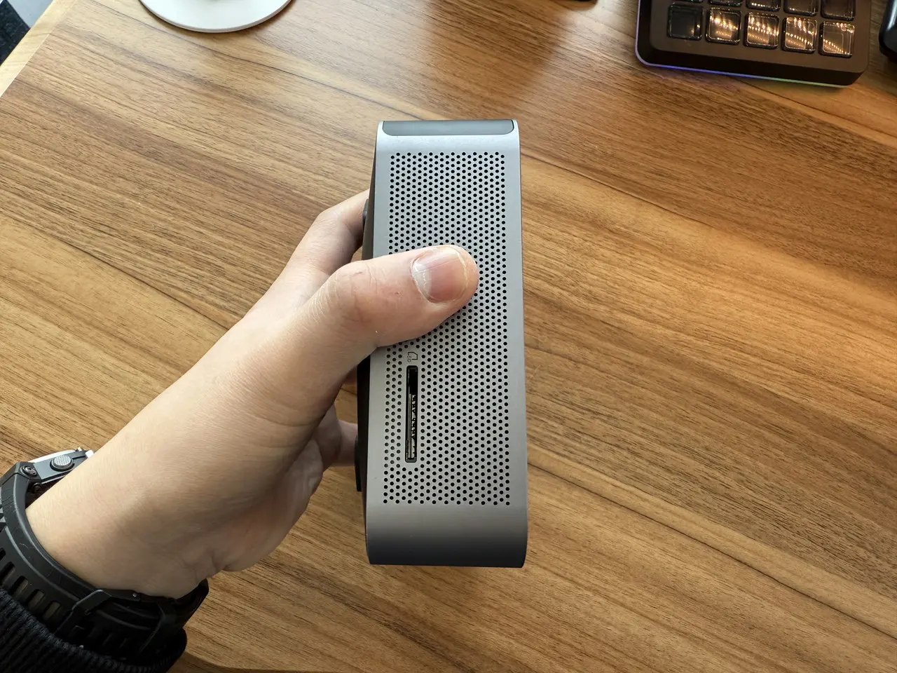 そして135×132×46.9mm、約703g(実測値)のコンパクトかつ軽量な筐体には充実のインターフェースが用意。USB 3.2 Gen 2 ポートおよびUSB 4 ポートが複数搭載されており、高速データ伝送に対応している。