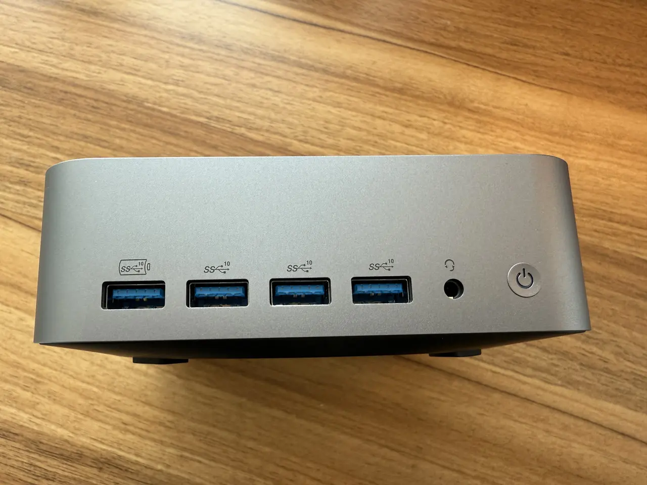 ▼本体正面。画像左側からUSB 3.2 Gen 2 Type-A ×4、3.5mmオーディオジャック、電源ボタンが搭載。