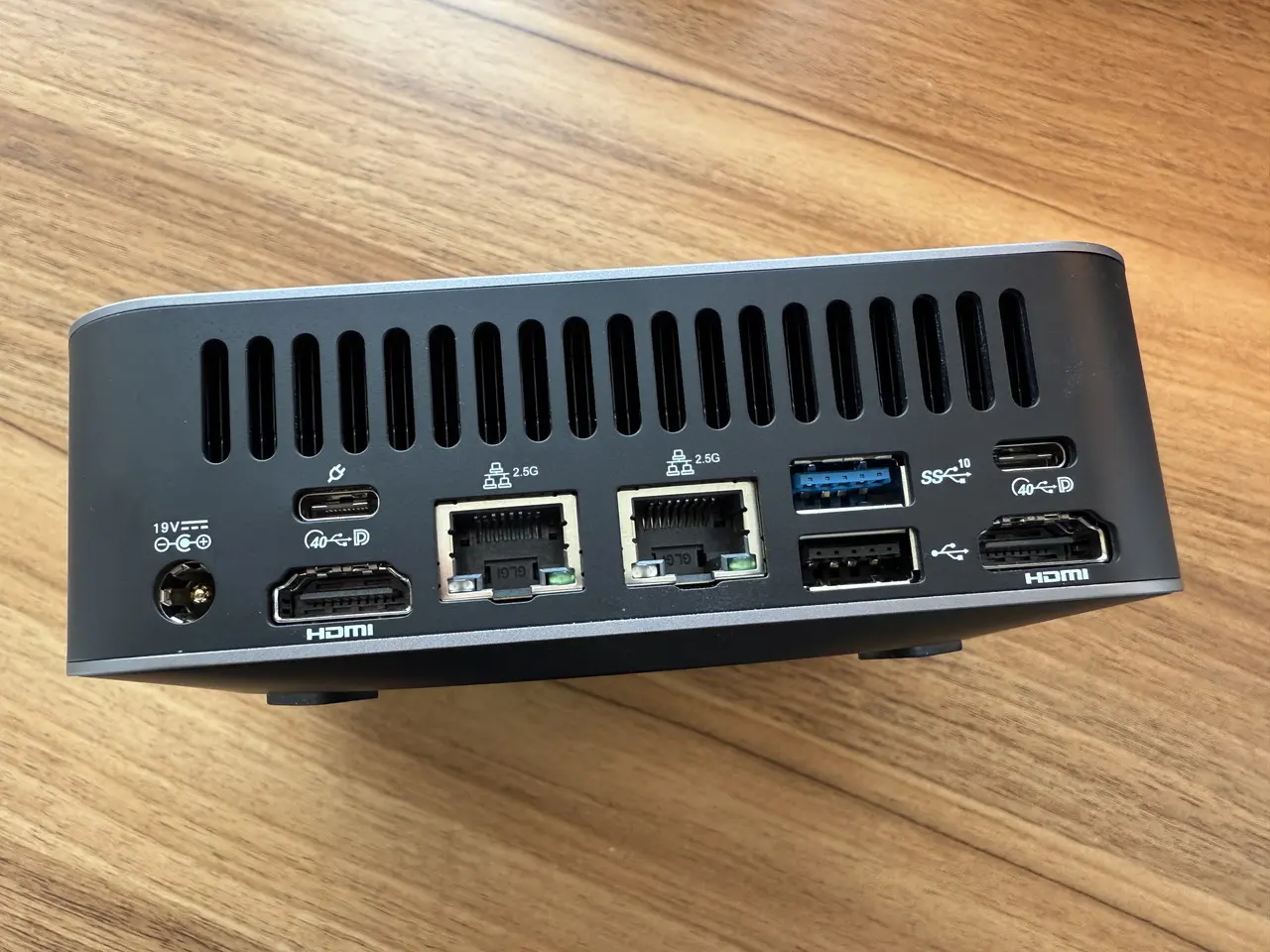 ▼後部の様子。DC電源ポート、USB 4 Type-C ×2、HDMI 2.0×2、RJ45 2.5Gbps LANポート×2、USB 3.2 Gen 2 Type-A、USB 2.0 Type-Aが用意。