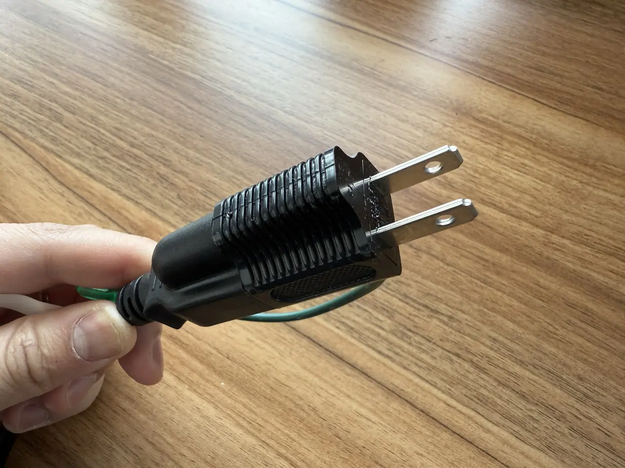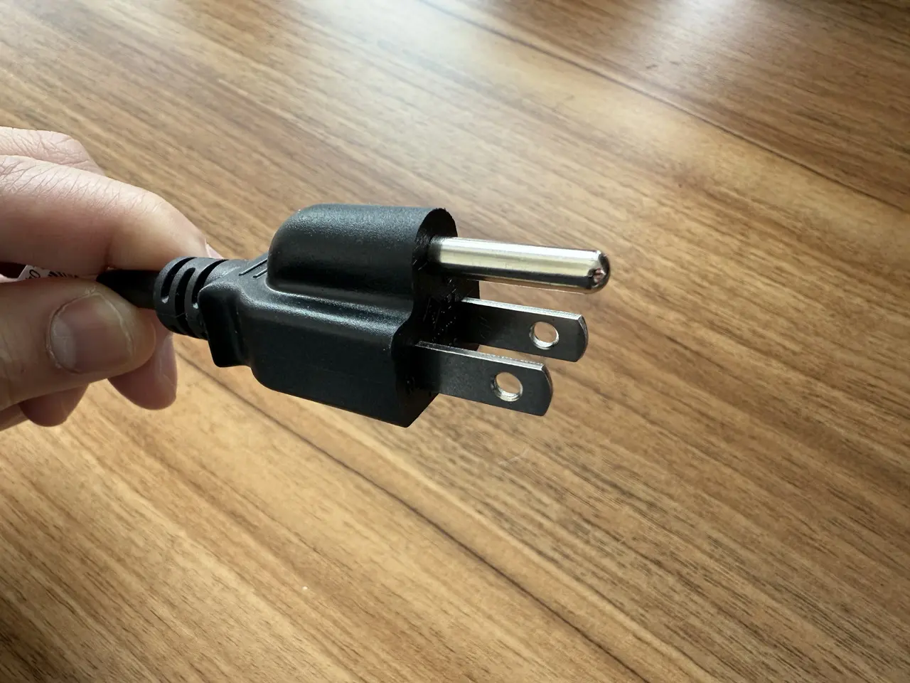 ▼付属する電源ケーブルは3P形状なので、一般的な住宅コンセントで使用する場合は3P⇒2P変換アダプタが必要になる場合があるので注意したい。