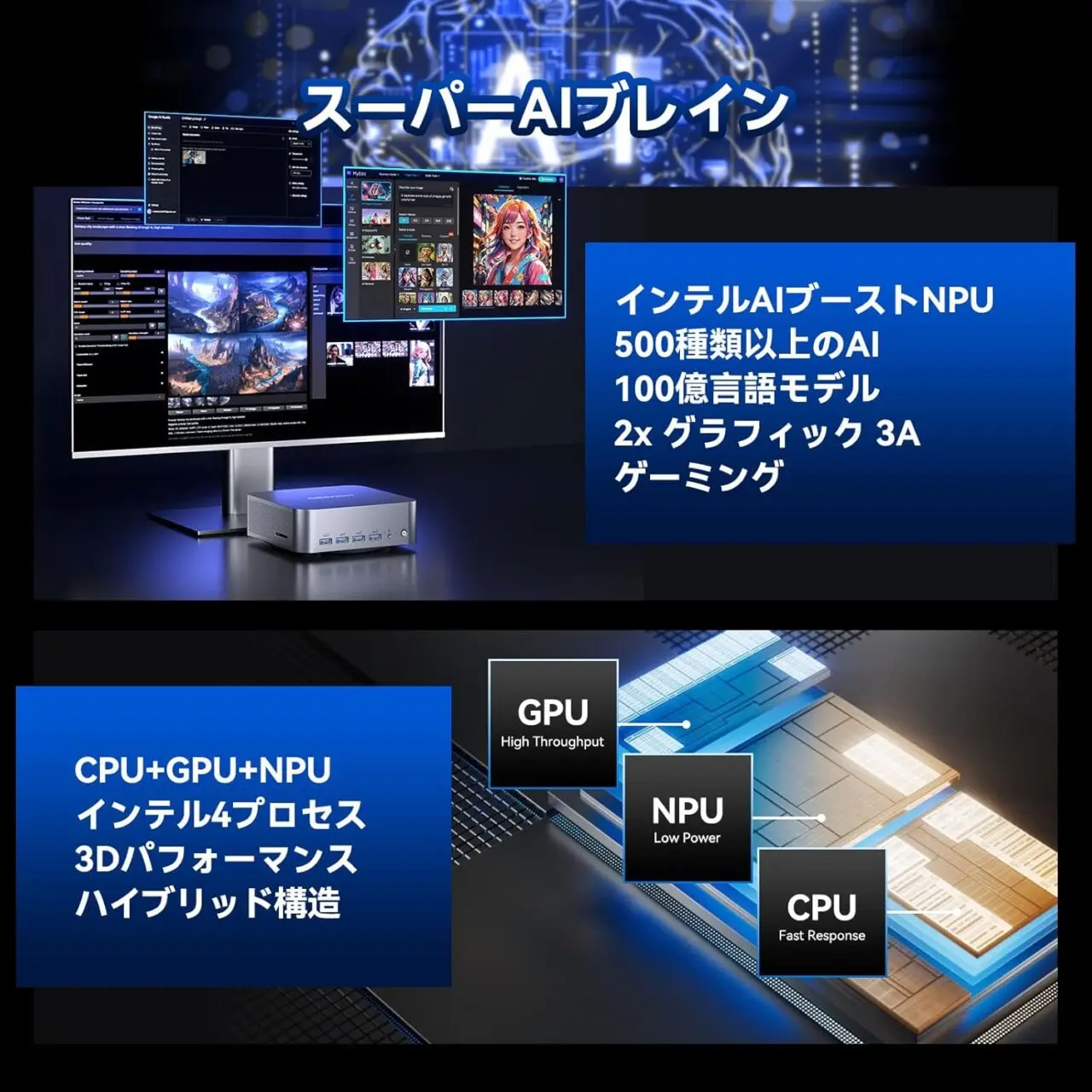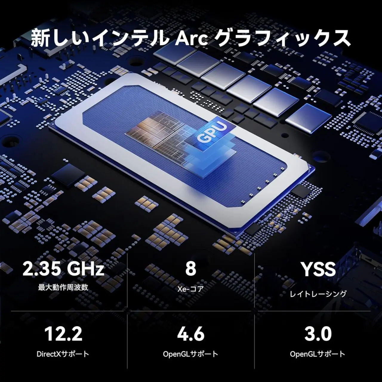 CPUに「Intel® Core™ Ultra 5-125H / 7-155H / 9 -185H」を、グラフィックス処理用に「Intel Arc i-GPU / Intel® Arc™ graphics」を採用しており、32GB DDR5 RAMおよび1TB / 2TB M.2 2280 SSDを備えるなど、10万円超えの価格にふさわしい、優れたパフォーマンスを発揮する高性能ミニPCとなっている。