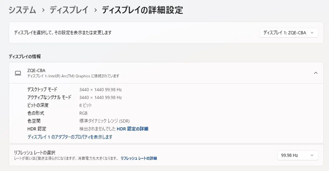 ▼映像出力情報。3440×1440・100fpsで快適に動作する。