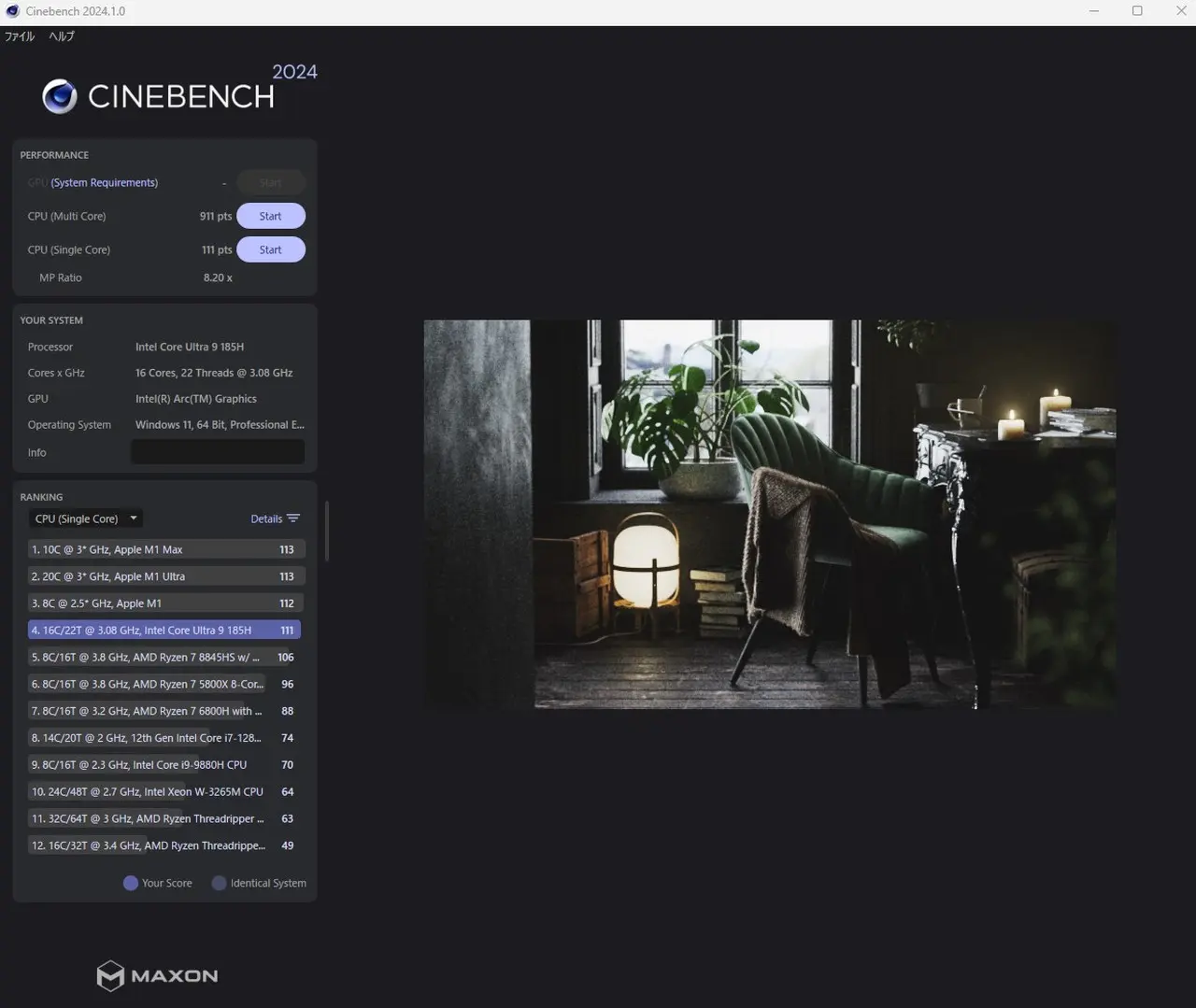 上記の条件でベンチマークテストを行った結果、スコア7,264点、評価は "やや快適" であった。