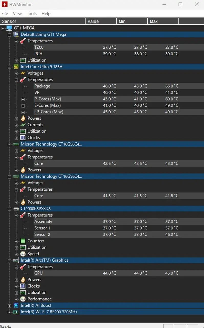 ▼5時間ほど高負荷状態でPCを稼働させ続けた際の内部温度(CPUID HWMonitorによる測定値)。
