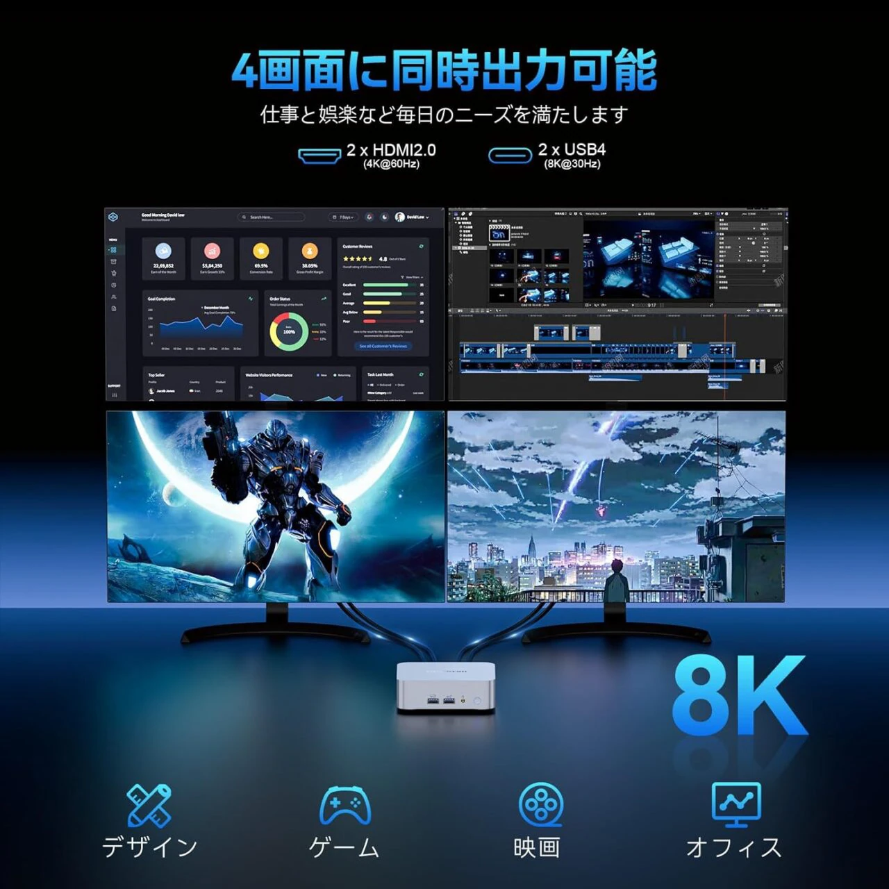 以上の通り、手のひらサイズのコンパクトな筐体サイズに対して、実用的なスペック構成を実現したミニデスクトップPCとなっています。仕事からクリエイティブな作業、ゲーミング、動画視聴にいたるまで、あらゆる用途に適した最新モデルです。