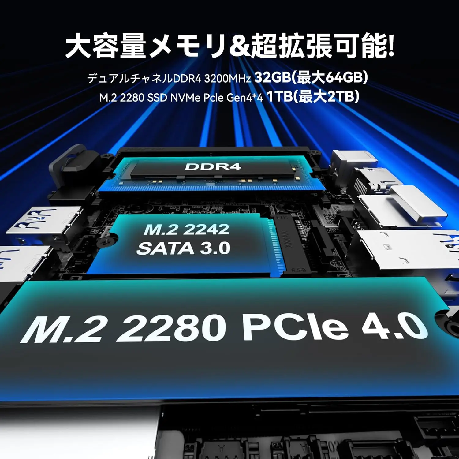 | RAM | 32GB デュアルチャネルDDR4 260PIN 3200MHz SODIMM、最大64GB |