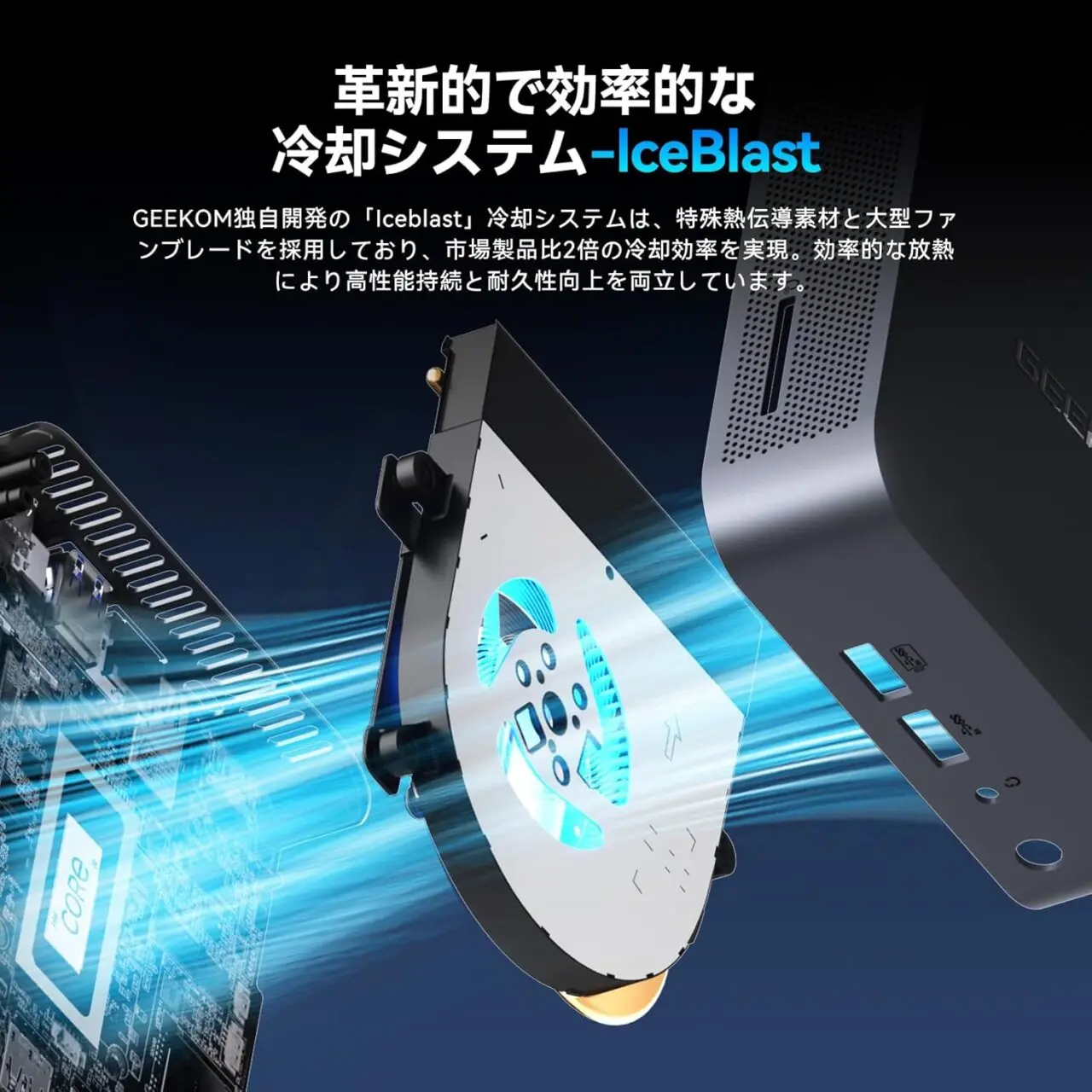 GEEKOM独自の効率的な熱循環機構「IceBlast」により、長時間の使用時にも内部に熱がこもりづらく、パフォーマンス低下を抑えることが可能となっています。