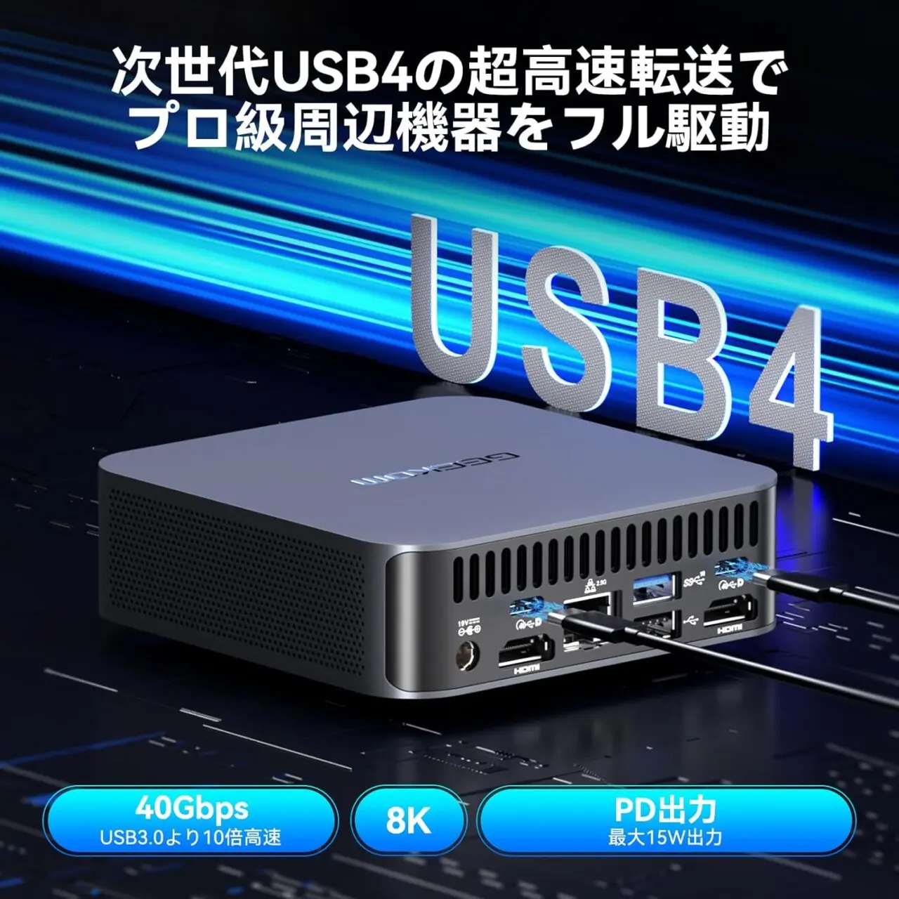 そして112.2×112.2×38mmのコンパクトな筐体には充実のインターフェースが用意。USB 3.2 Gen 2 ポートおよびUSB4 Gen 3ポートが搭載されており、高速データ伝送に対応しています。