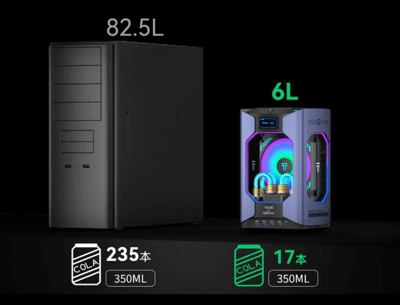 一般的なタワー型ゲーミングPC(容積82.5L)と比べて、わずか7%程度(5.7L)の非常にコンパクトな筐体サイズを実現。