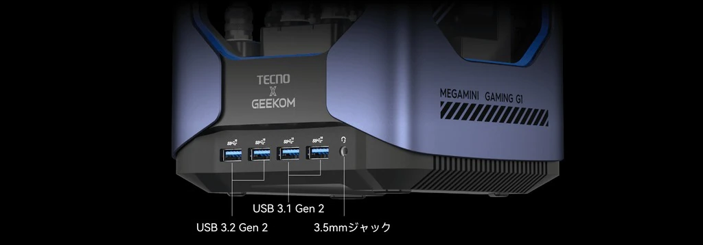 筐体前面にはUSB 3.2 Gen 2 ポートおよびUSB 3.1 Gen 1ポートを搭載。3.5mmジャックも用意されており、外部サウンドデバイスとの接続に対応しています。