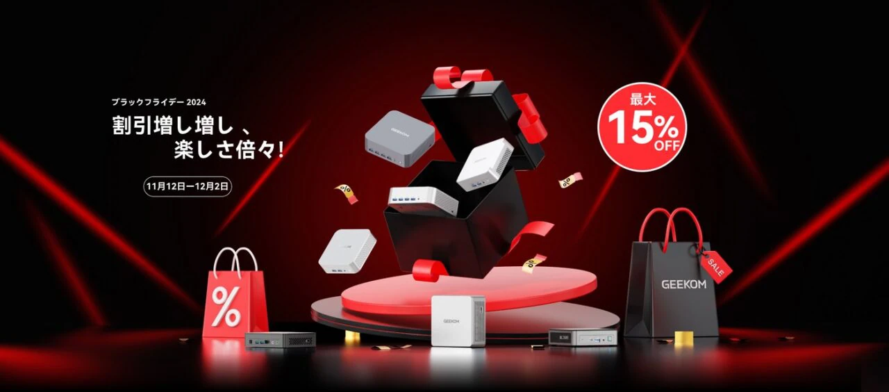 なお、2024年11月12日(火)~ 12月2日(月)までの期間中、GEEKOM公式サイトにおいてブラックフライデーセール2024が開催中です。同セールでは、GEEKOMの人気ミニPCを最大15%OFFの割引価格で購入できます。