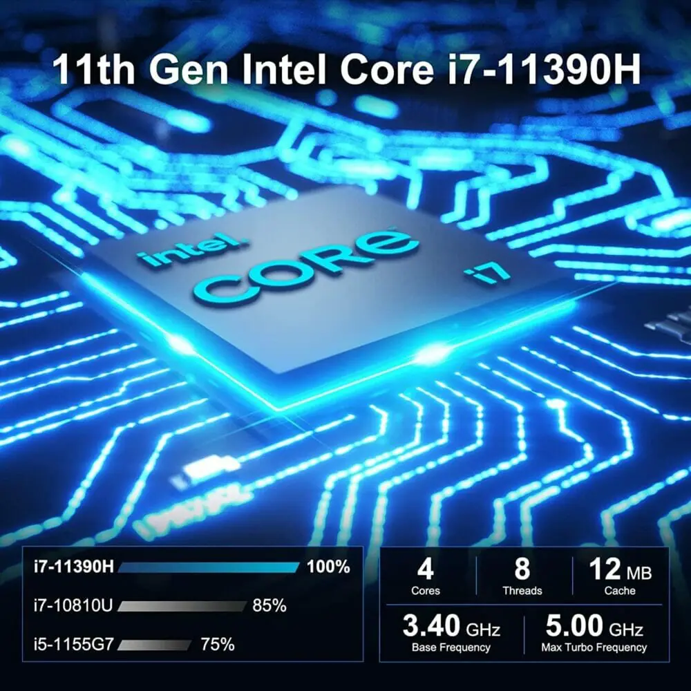 小型な筐体に対してCPUにはIntel Core i7-11390Hを採用。RAMを16GB/32GB搭載するなど充実したスペック構成となっており、リモートワークやテレワーク仕事はもちろん、YouTubeやネットフリックス等のメディア視聴用途にも適している。