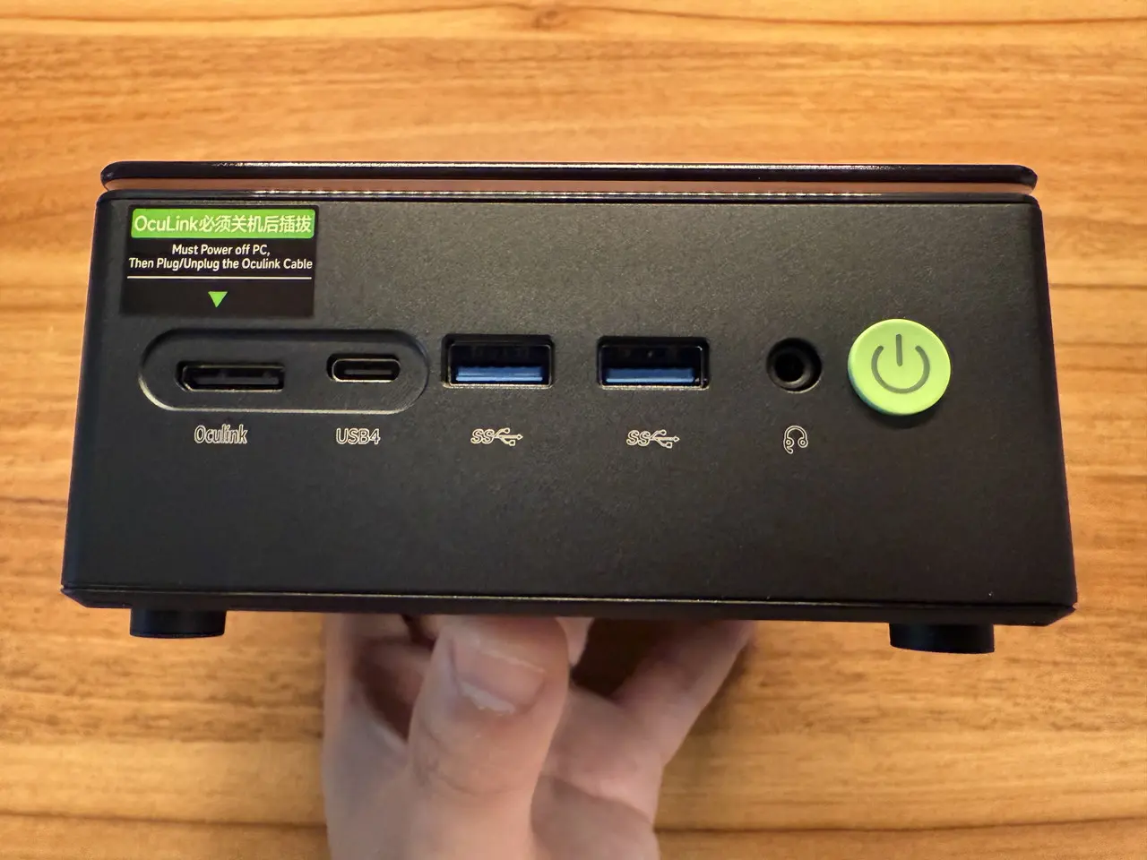 正面には 電源ボタン、3.5mmジャック、USB Type-A 3.2 Gen 2×2、USB4 (PD/DP/データ転送)、Oculink PCIE 4.0 が用意。