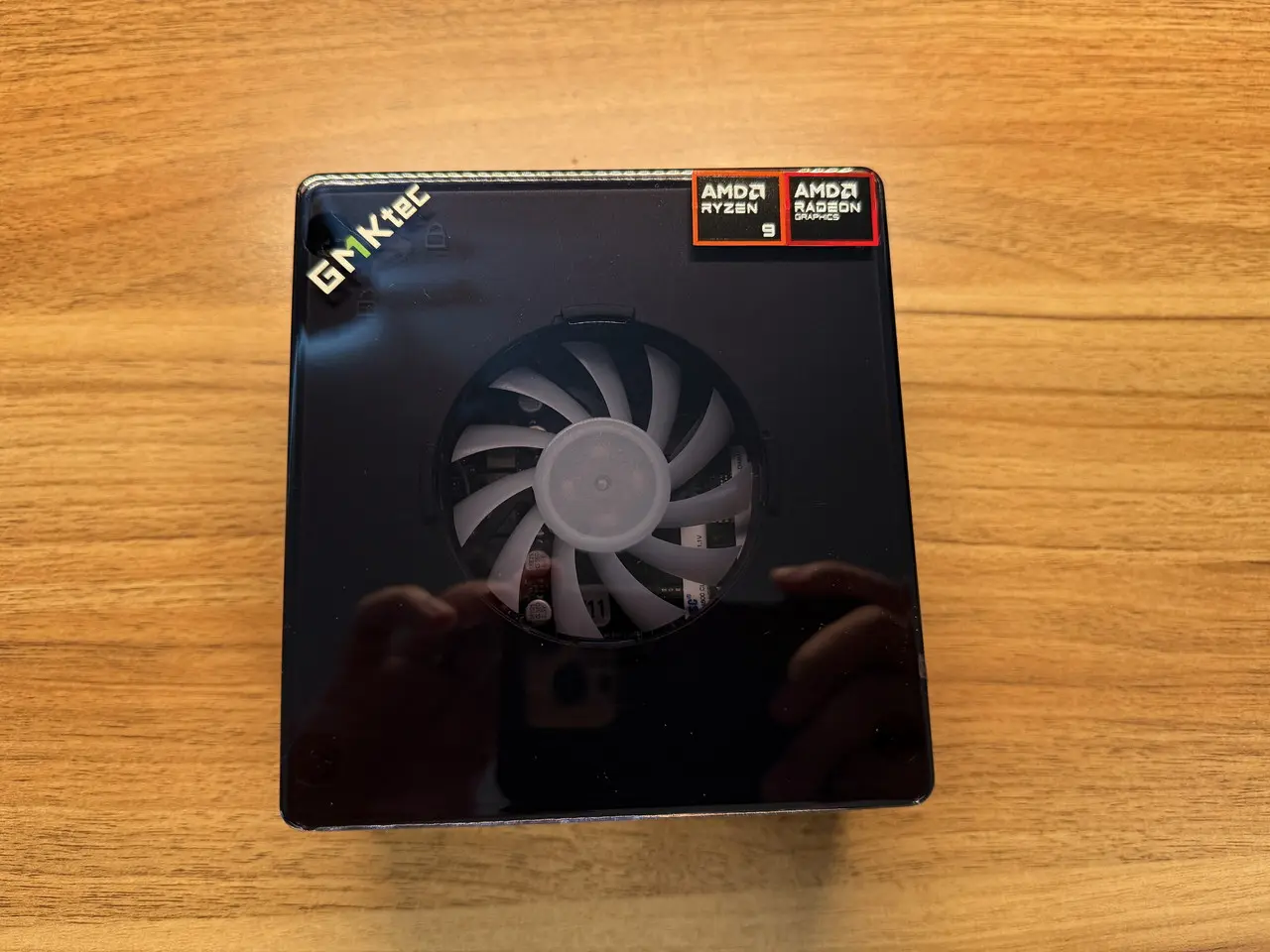 『GMKtec K11』の本体サイズは、132×125×58mmとコンパクト。全体的に黒色を基調としたスタイリッシュなデザインで、天板は内蔵ファンが見えるスケルトン仕様となっています。