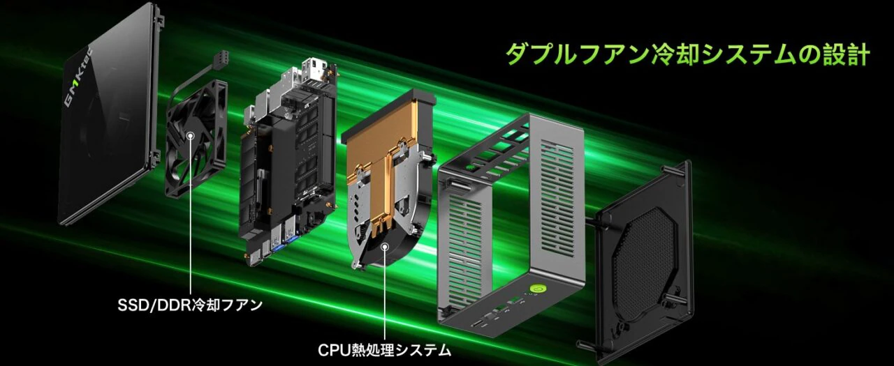 筐体内部にはデュアルファンシステムが装備されており、優れた冷却能力でミニPCのパフォーマンスを維持できる。