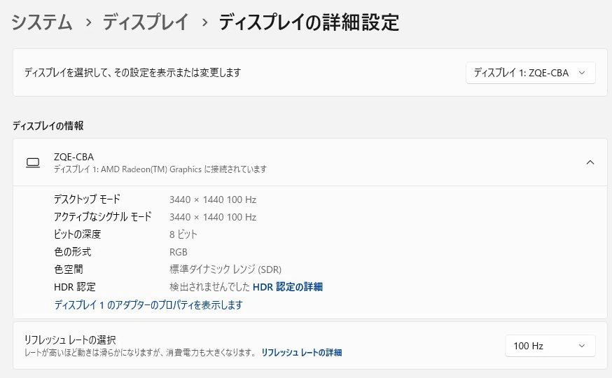 ▼映像出力情報。3440×1440・100Hzで快適に動作する。