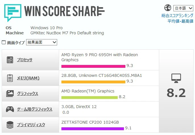 Windowsエクスペリエンスインデックスの測定結果は以下の通り。全体的にスコアが高く、特にグラフィックス処理性能に関しても、ミニPCにもかかわらず8.2点とそこそこ優れたスコアを記録できていた。