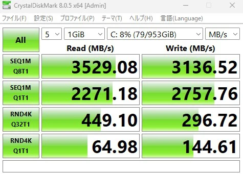 CrystalDiskMarkでのテスト結果は以下の通り。流石はM.2 SSDを搭載していることもあり、シーケンシャル性能は、非常に高速な部類だ。OSの動作やソフトウェアの起動、一般的な作業においてもスムーズな動作を期待できる。
