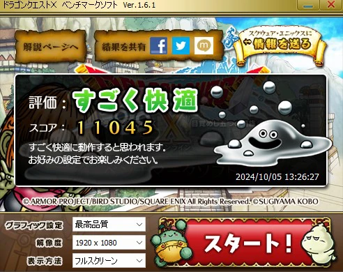 グラフィックス設定を "最高品質" にしたにもかかわらず、11,045点という高スコアを記録。評価は "すごく快適" という結果となった。