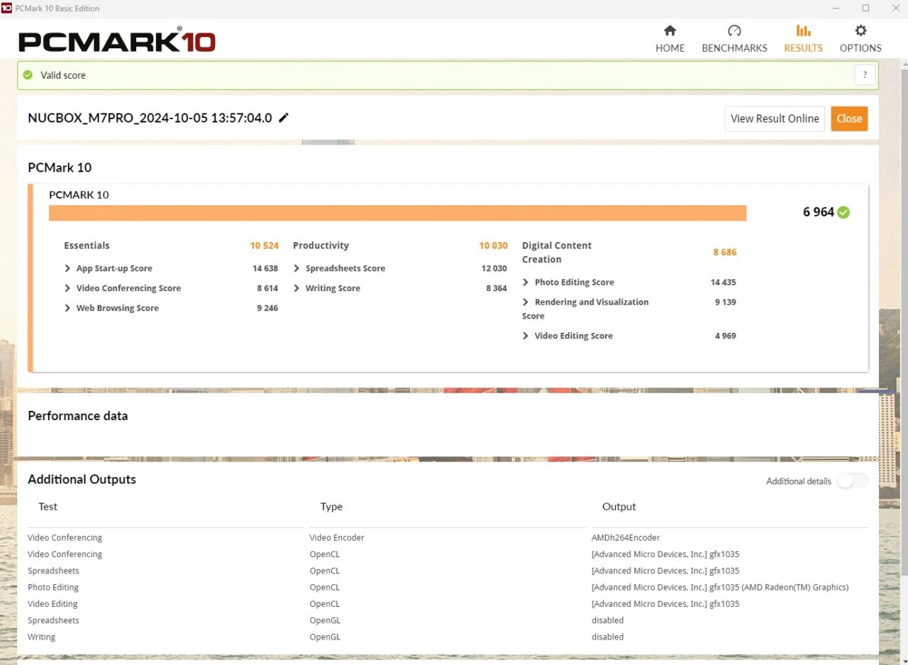 PCMARK10(無料版)のスコアは6,964点で、一般的なPC作業(文書作成・ウェブブラウジング・作業用アプリ使用)から軽めのゲーミングまで、幅広い用途に対応できる性能だと言える。