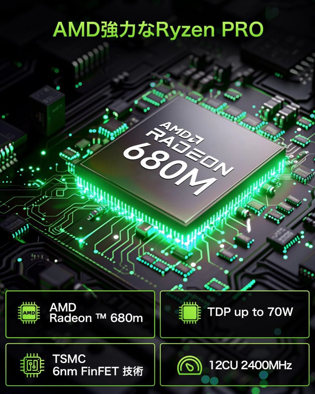 本製品は「AMD Radeon 680M」によるグラフィック処理を行っており、ミニPCながらも優れた描画処理性能を実現している。
