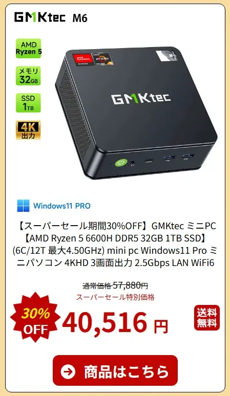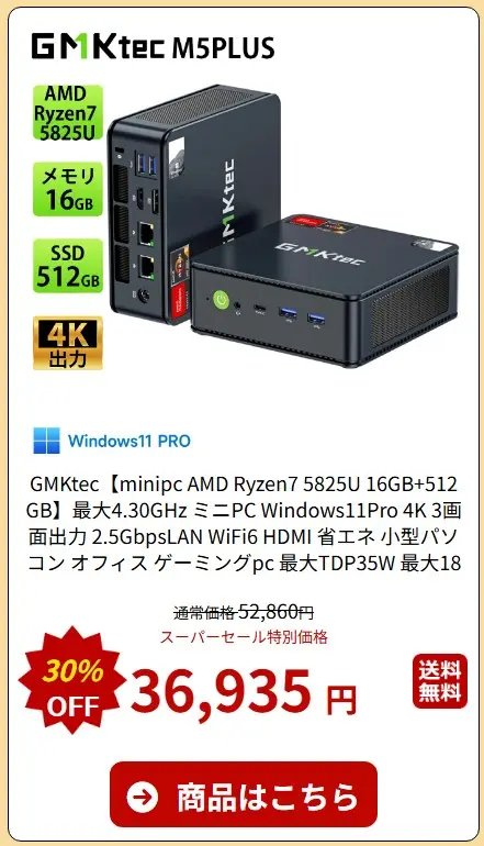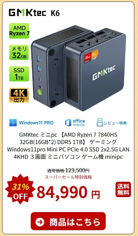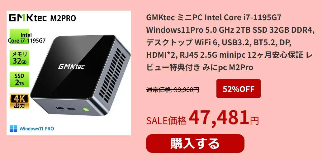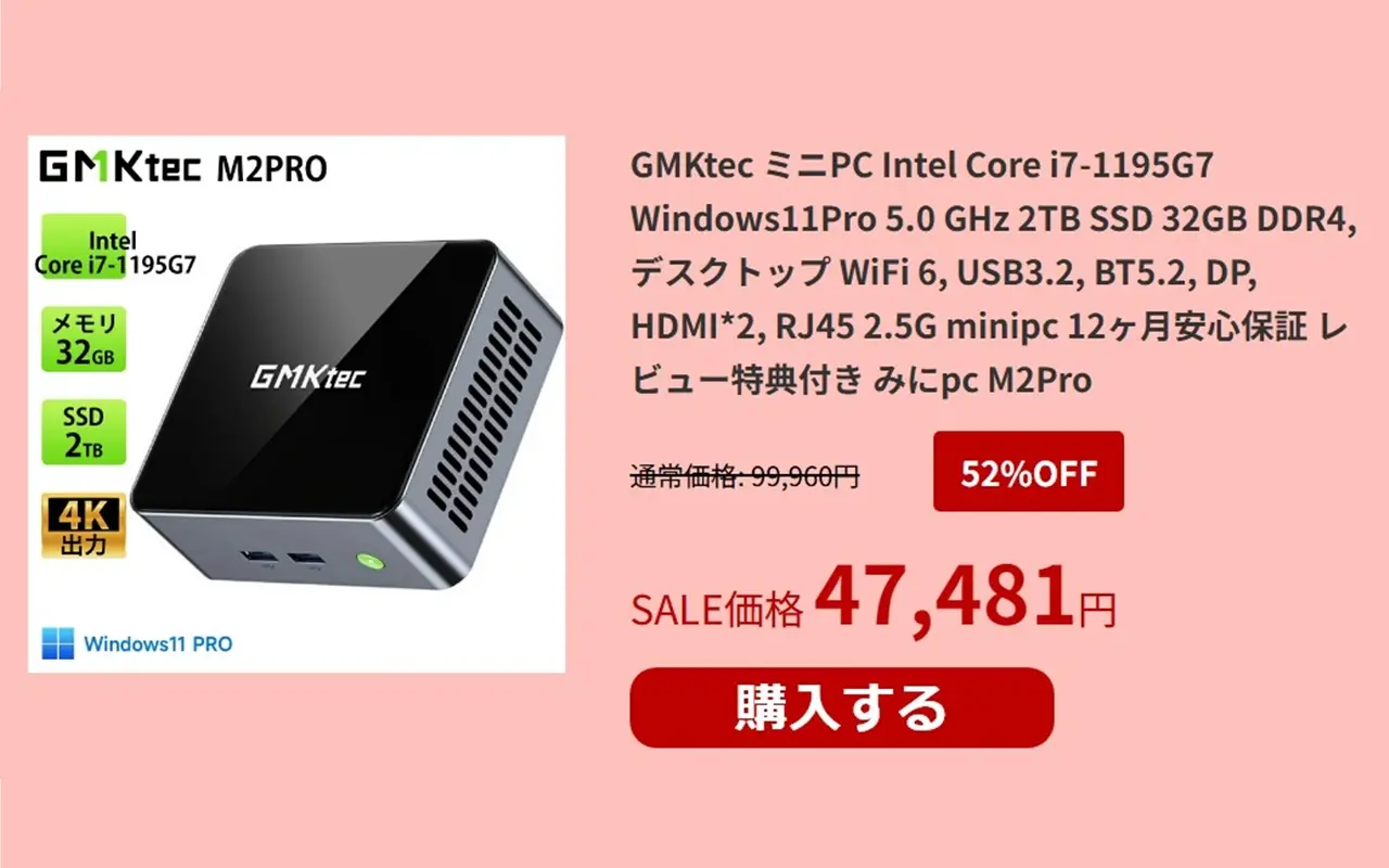 2025年6月4日(水)20:00 ~6月11日(水)01:59の期間中に実施されている「楽天スーパーセール」において、GMKtecの人気ミニPCの数々を最大52%OFFで購入することができます。